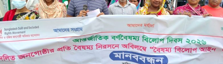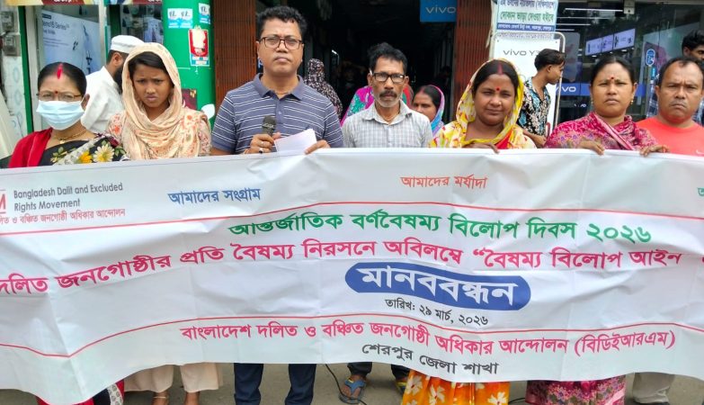 স্টাফ রিপোর্টার :শেরপুরে আন্তর্জাতিক বর্ণবৈষম্য বিলোপ দিবস উপলক্ষে মানববন্ধন কর্মসূচি পালন করা হয়েছে। ২৯ মার্চ রোববার দুপুরে শহরের নিউমার্কেট মোড়ে বাংলাদেশ দলিত ও বঞ্চিত জনগোষ্ঠী