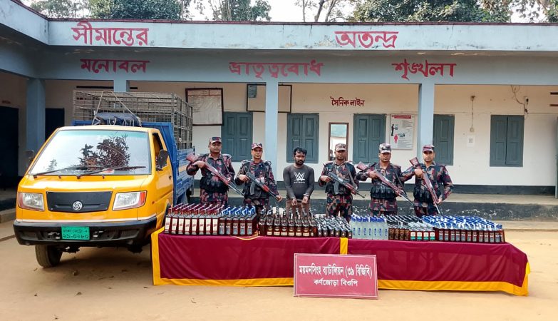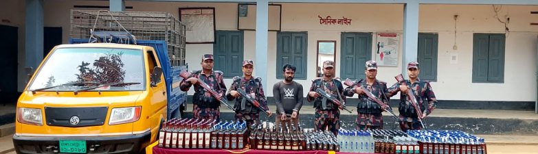 শ্রীবরদী সীমান্তে বিজিবির অভিযানে পিকআপ ভর্তি ৫৪৫ বোতল মদ সহ আটক -১