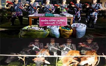 নিজস্ব প্রতিনিধি: ময়মনসিংহ ব্যাটালিয়ন (৩৯ বিজিবি) কর্তৃক পরিচালিত পৃথক অভিযানে সীমান্ত এলাকার বিভিন্ন স্থান থেকে অর্ধকোটি টাকার চোরাচালানী মালামাল, পাঁচটি ভারতীয় গরু এবং অবৈধভাবে ভারতে অনুপ্রবেশের সময় ২৪ জন বাংলাদেশি নাগরিকসহ দুই মানবপাচারকারীকে আটক করেছে বিজিবি সদস্যরা। বিজিবি সূত্রে জানা গেছে, গোপন সংবাদের ভিত্তিতে অদ্য ৭ অক্টোবর (সোমবার) ময়মনসিংহ ব্যাটালিয়ন (৩৯ বিজিবি)-এর অধীনস্থ হালুয়াঘাট উপজেলার জামগড়া সীমান্তসহ শেরপুর জেলার শ্রীবরদী ও নালিতাবাড়ী উপজেলার হাতিরকোনা, হাতিবর, চায়নামোড় এবং রামচন্দ্রকুড়া সীমান্ত এলাকায় একাধিক অভিযান পরিচালনা করা হয়। অভিযানে ভারতীয় মদ ১৫৫ বোতল, জিলেট ব্লেড ১ লাখ ৪৮ হাজার পিস, জিরা ২৭০ কেজি এবং ৫টি ভারতীয় গরু আটক করা হয়। এছাড়া, শেরপুরের ঝিনাইগাতী উপজেলার গজারি বাগান এলাকা থেকে অবৈধভাবে সীমান্ত অতিক্রমের সময় ২ জন মানবপাচারকারীসহ মোট ২৪ জন বাংলাদেশি নাগরিককে আটক করা হয়। তাদের কাছ থেকে ১৪টি মোবাইল ফোন, ১টি হাতঘড়ি, ১টি পাওয়ার ব্যাংক, নগদ ৫৪হাজার ৪শত টাকা এবং ৪টি সিএনজি জব্দ করা হয়। আটককৃত সব চোরাচালানী মালামাল ও সামগ্রীর মোট সিজার মূল্য ৫৩ লাখ ৪৩ হাজার ৯শ টাকা বলে জানিয়েছে বিজিবি। ময়মনসিংহ ব্যাটালিয়ন (৩৯ বিজিবি) জানিয়েছে, তারা ময়মনসিংহ ও শেরপুর জেলার আন্তর্জাতিক সীমান্ত রক্ষায়, মাদক ও চোরাচালান প্রতিরোধে এবং অবৈধ অনুপ্রবেশ ঠেকাতে সর্বদা সতর্ক অবস্থানে রয়েছে। বিজিবি সীমান্ত নিরাপত্তা জোরদার ও অবৈধ কর্মকাণ্ড দমন অভিযানে কঠোর অবস্থান বজায় রাখছে, যা ভবিষ্যতেও অব্যাহত থাকবে বলে জানিয়েছে ব্যাটালিয়ন কর্তৃপক্ষ।